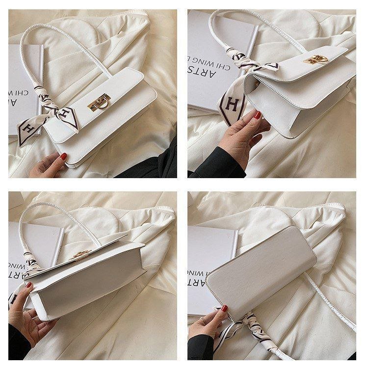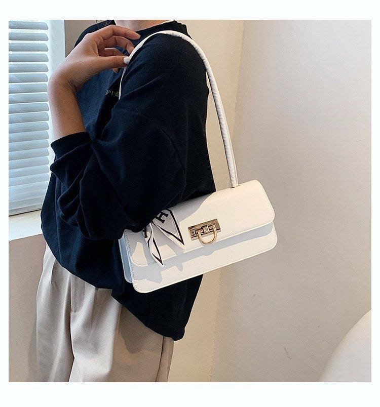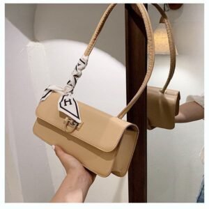 This is a sleek and sophisticated underarm baguette-style bag designed for a modern, high-fashion look. Its structured silhouette is complemented by a stylish printed scarf tied to the handle, making it a perfect accessory for both casual and formal outings.