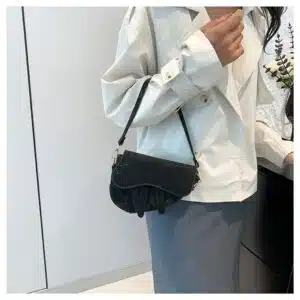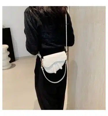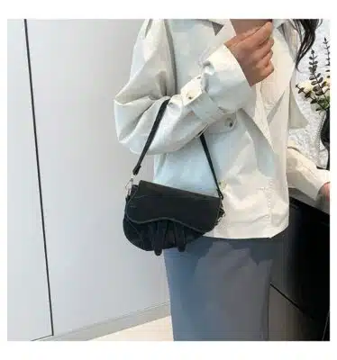 This chic saddle bag features a unique asymmetric curved flap and playful vertical leather tassel accents, offering a modern twist on a classic equestrian-inspired silhouette. Designed for effortless style, its compact yet structured shape is perfect for carrying your daily essentials while adding a trendy edge to any outfit. Whether worn as a crossbody for hands-free convenience or as a short shoulder bag, this piece is a versatile must-have for the contemporary wardrobe.