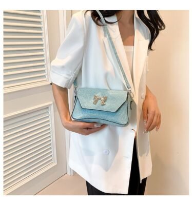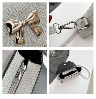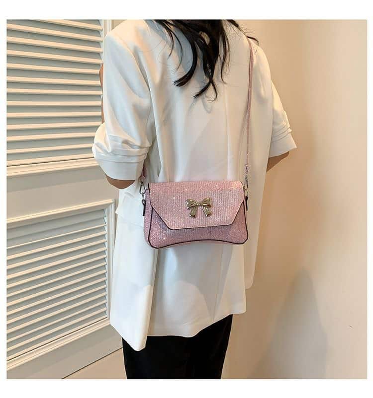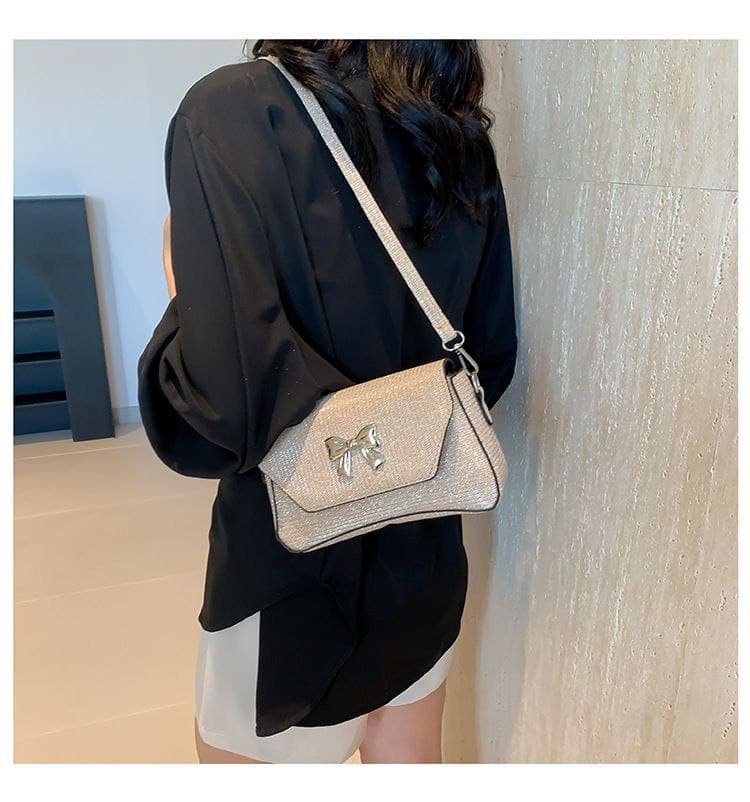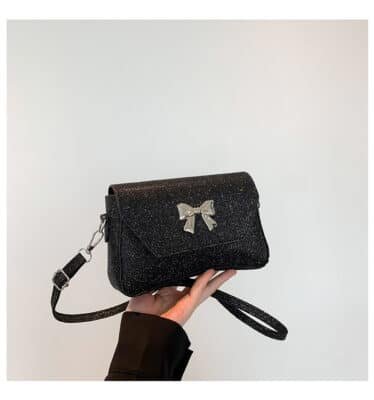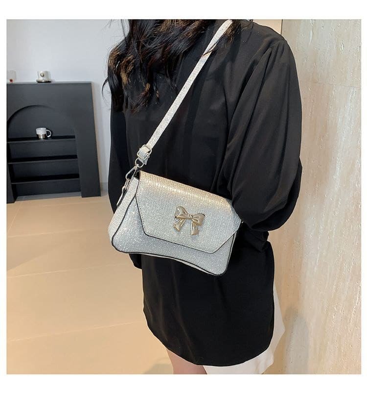 This chic and festive flap bag is designed to add a touch of sparkle to any ensemble. Featuring a sophisticated shimmering finish and a graceful metallic bow centerpiece, this bag perfectly balances playful charm with elegant structure. Its compact size and versatile strap make it an ideal choice for evening parties, weddings, or adding a high-fashion edge to your daily street style.