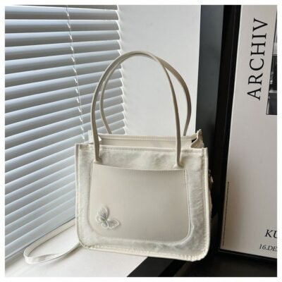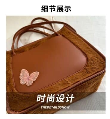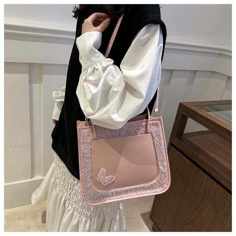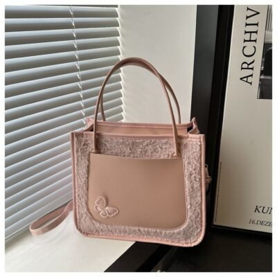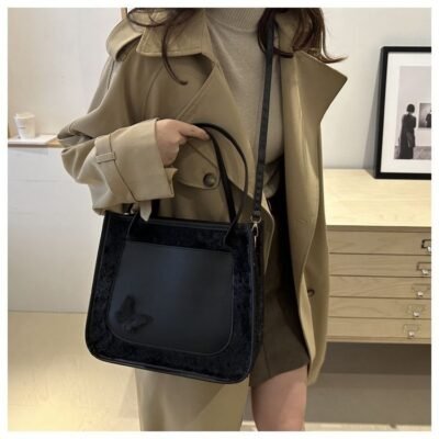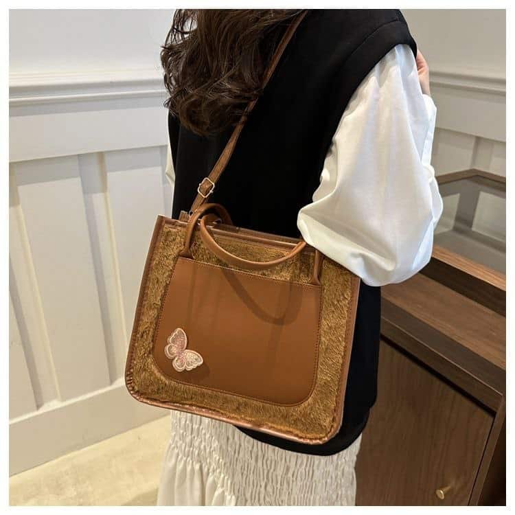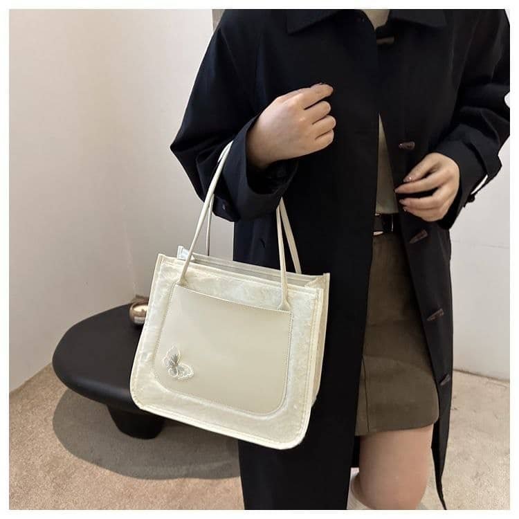 This elegant tote bag combines a sophisticated structured design with whimsical details. Featuring a plush, textured border and a delicate butterfly appliqué on the front pocket, it is the perfect accessory for those who appreciate feminine and unique fashion. Its spacious interior and long shoulder straps make it a practical choice for carrying daily essentials while maintaining an upscale look.