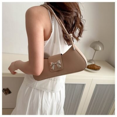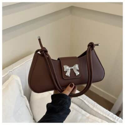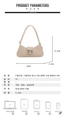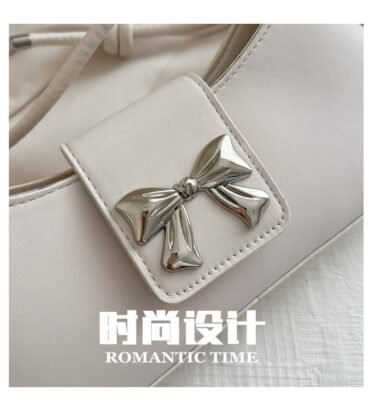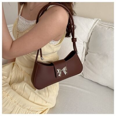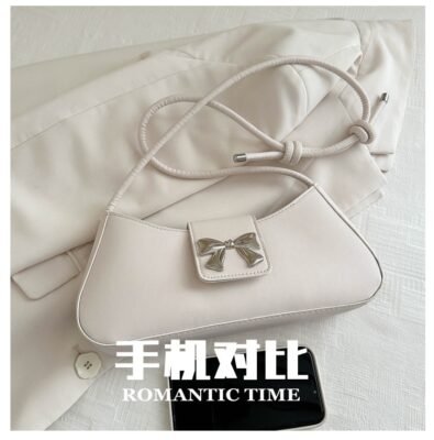 This is a feminine and stylish baguette-style handbag featuring a signature metallic bow ribbon buckle on the front flap. Its elongated, minimalist design and soft color palette make it an ideal choice for adding a touch of elegance to any daytime or evening outfit.