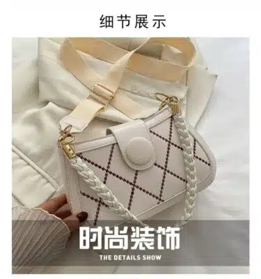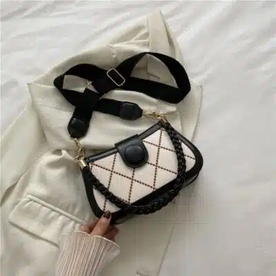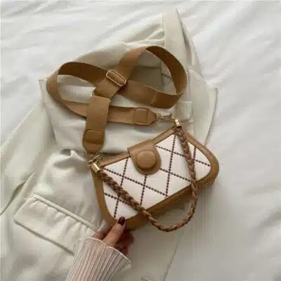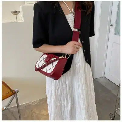 This chic and modern shoulder bag features a striking diamond-quilted pattern with bold contrast piping. Designed for the fashion-forward individual, it combines a structured rectangular silhouette with a thick, trendy webbing strap and a coordinating braided handle. Whether you’re heading to a casual brunch or a stylish evening event, this bag offers a unique mix of texture and color to complete your outfit.