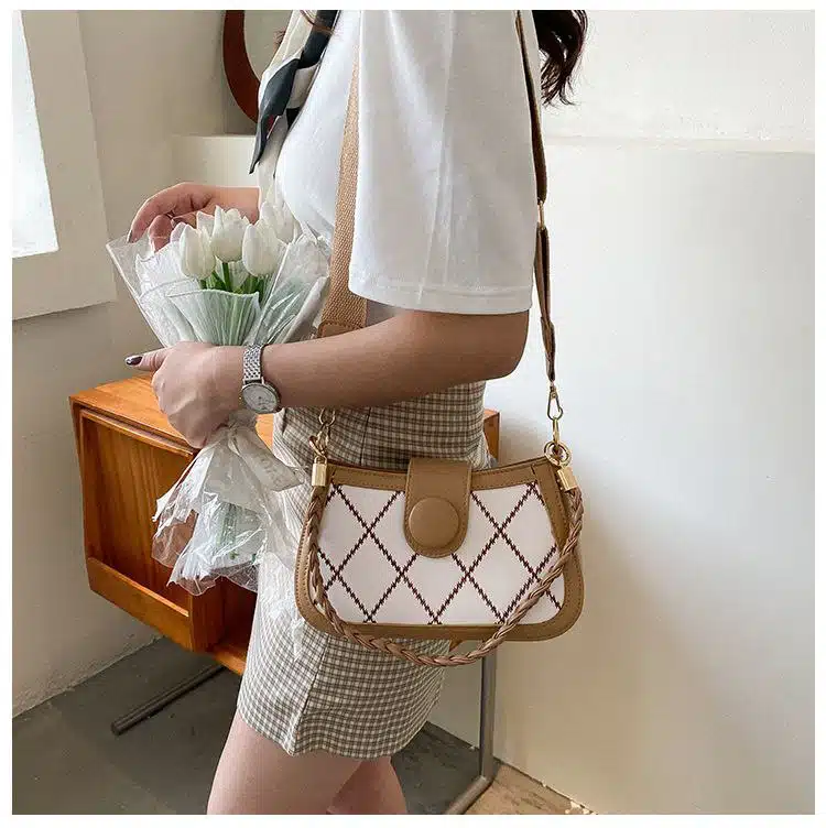 Design Highlight: Features a classic diamond-lattice stitched body, a secure front flap with a circular button accent, and dual carrying options.