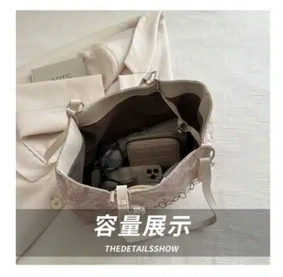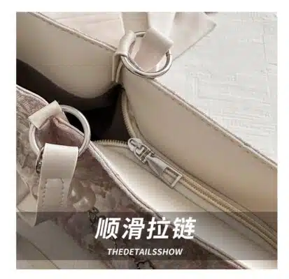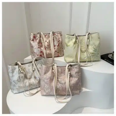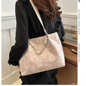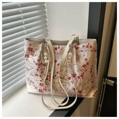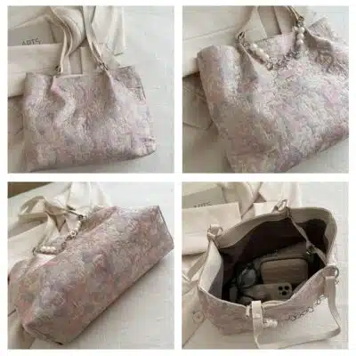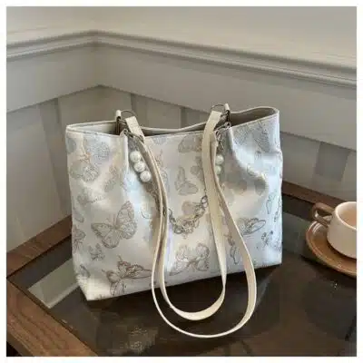 This is a sophisticated and high-capacity tote bag featuring intricate floral and butterfly jacquard patterns. Its refined aesthetic is enhanced by delicate pearl-accented straps, making it a perfect choice for those who appreciate classic elegance with a modern twist.