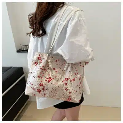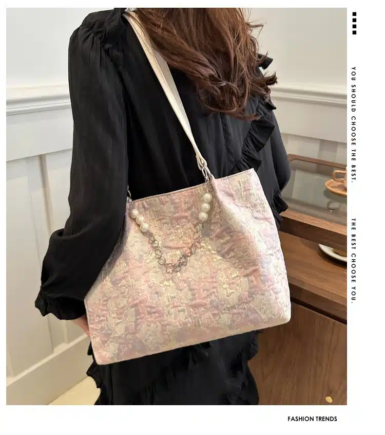 Product Name: Elegant Floral Jacquard Tote with Pearl Pendant