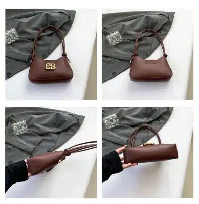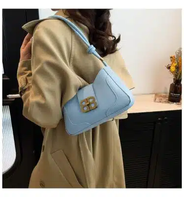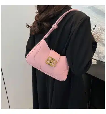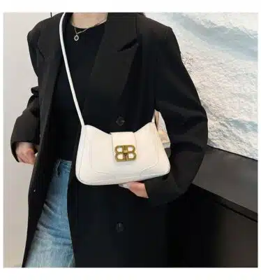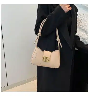This chic shoulder bag features a modern, clean silhouette with a slightly curved topline and a prominent gold-tone metallic buckle centerpiece. Its minimalist design makes it a highly versatile accessory that can easily transition from a day at the office to an evening out. The structured body ensures the bag maintains its sophisticated shape, while the compact size provides just enough room for your most important items.