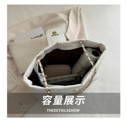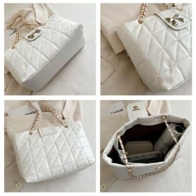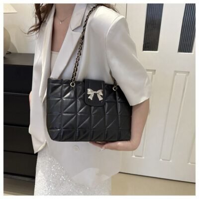 This sophisticated quilted tote combines timeless elegance with modern flair. Featuring a classic diamond-stitched pattern and a chic metallic bow emblem, this bag is designed to be both a stylish statement piece and a practical daily companion. Its spacious interior and gleaming gold-tone chain-link straps make it perfect for the office, shopping, or evening social events.
