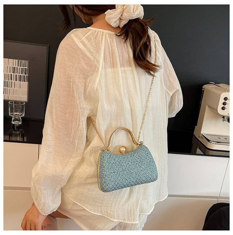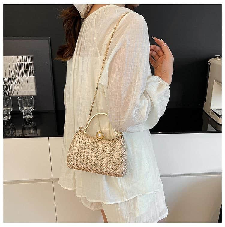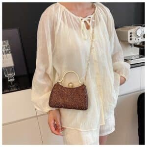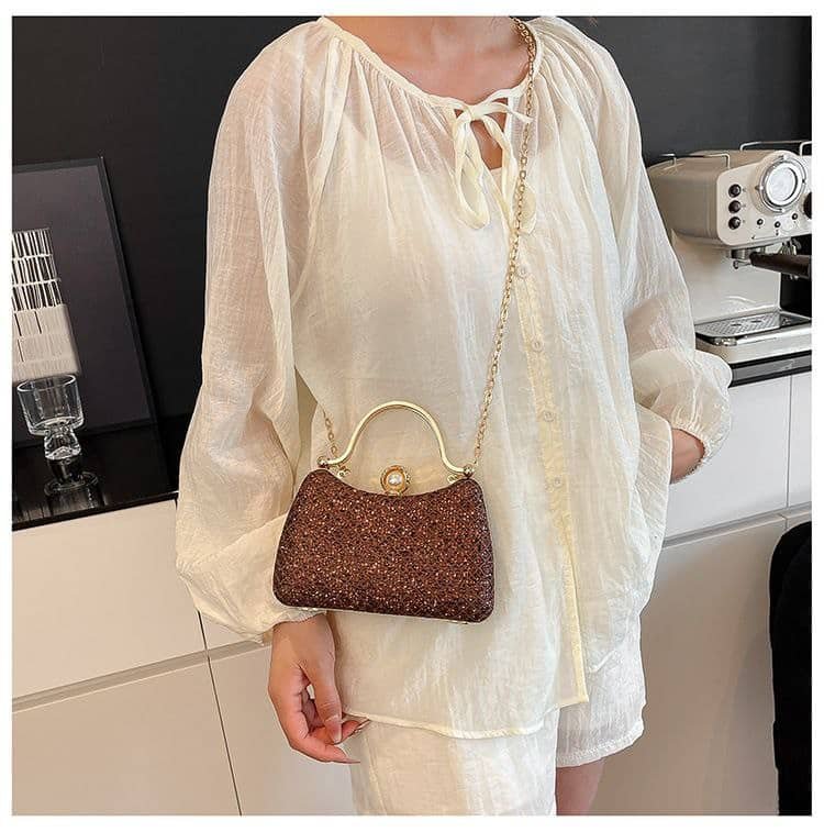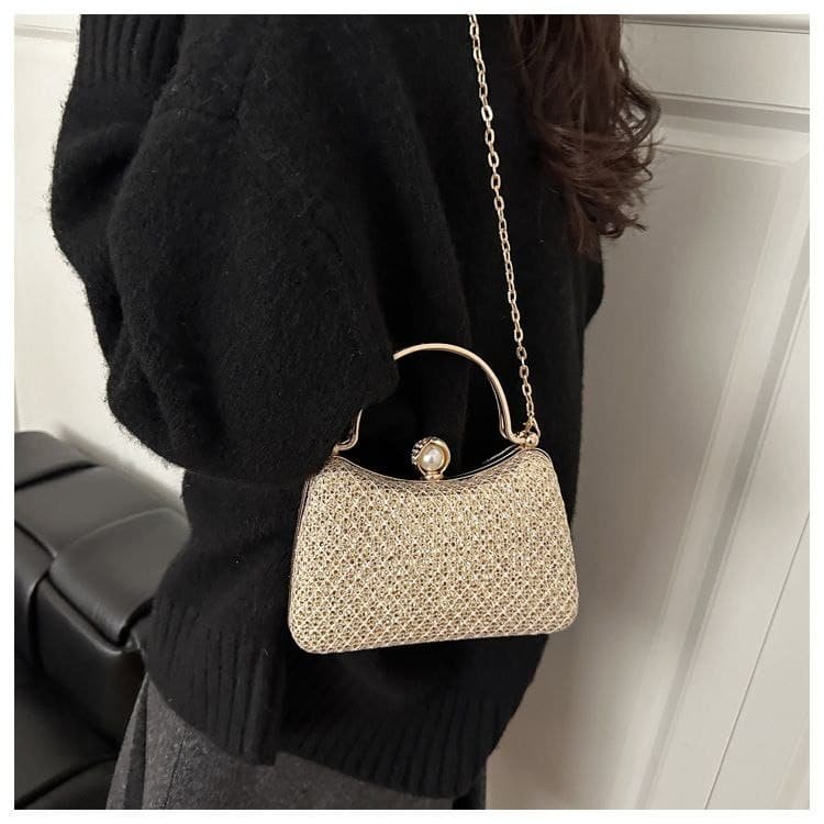 Product Description This stunning evening clutch is designed to radiate elegance and glamour at any formal event. Featuring a shimmering metallic mesh exterior and a unique structured silhouette, it serves as the perfect statement piece for weddings, parties, or gala evenings. The bag is accented with a polished gold-tone metal handle and a beautiful pearl-encrusted clasp, offering a sophisticated and high-end aesthetic that complements any elegant ensemble.