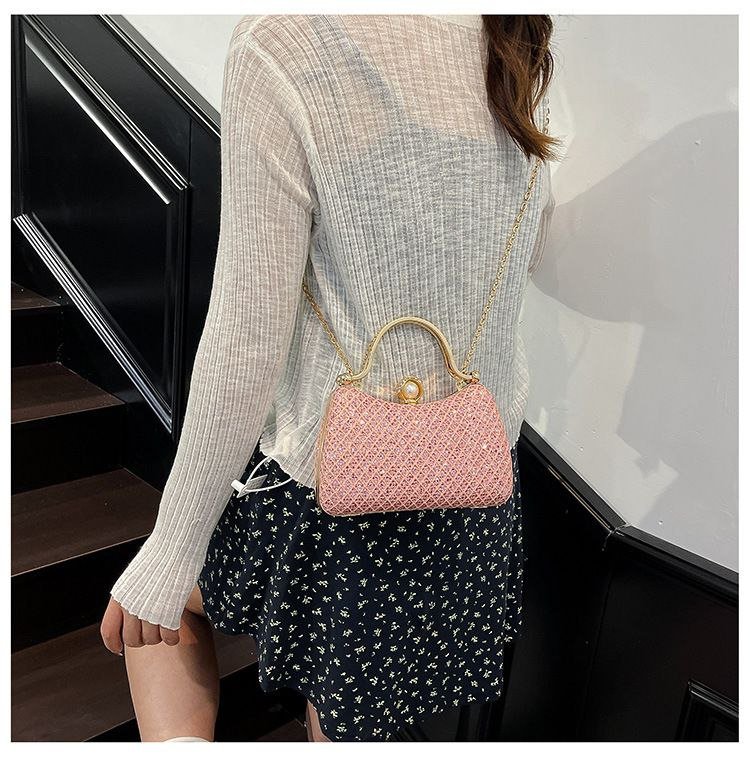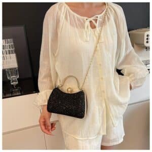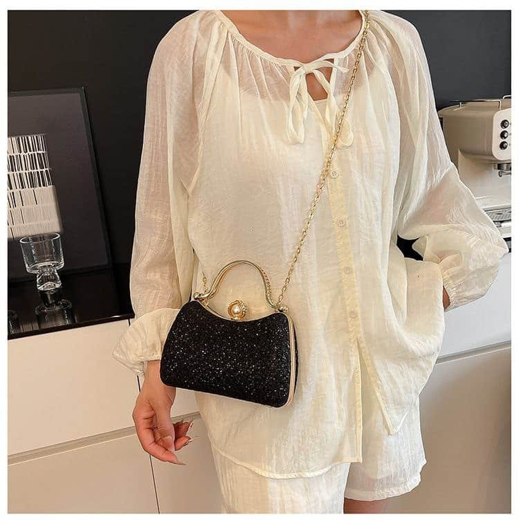 Design Highlight: A distinctive pearl-style spherical clasp and a curved metallic frame provide a refined and luxurious finish.