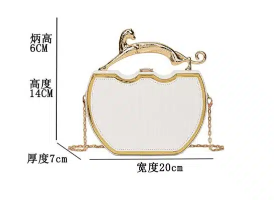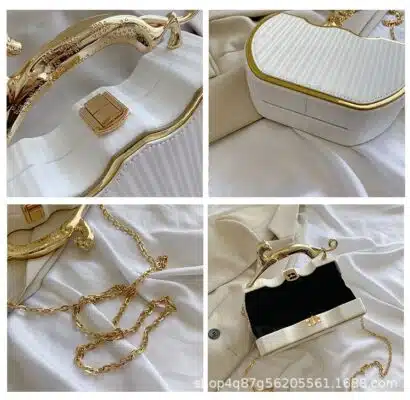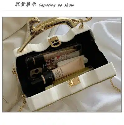 This exquisite evening clutch is a true masterpiece of wearable art, designed to make a bold statement at any high-profile event. The centerpiece of this bag is its stunning, sculptural gold-tone panther handle, which elegantly arches across the top of the unique crown-shaped body. With its sleek white exterior and shimmering metallic accents, this clutch perfectly balances fierce modern energy with timeless luxury.