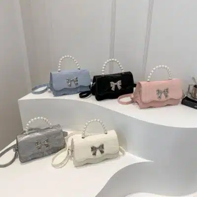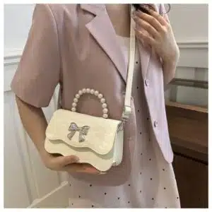 Design Highlight: Eye-catching pearl handle, metallic bow centerpiece, and a stylish scalloped-edge front flap.