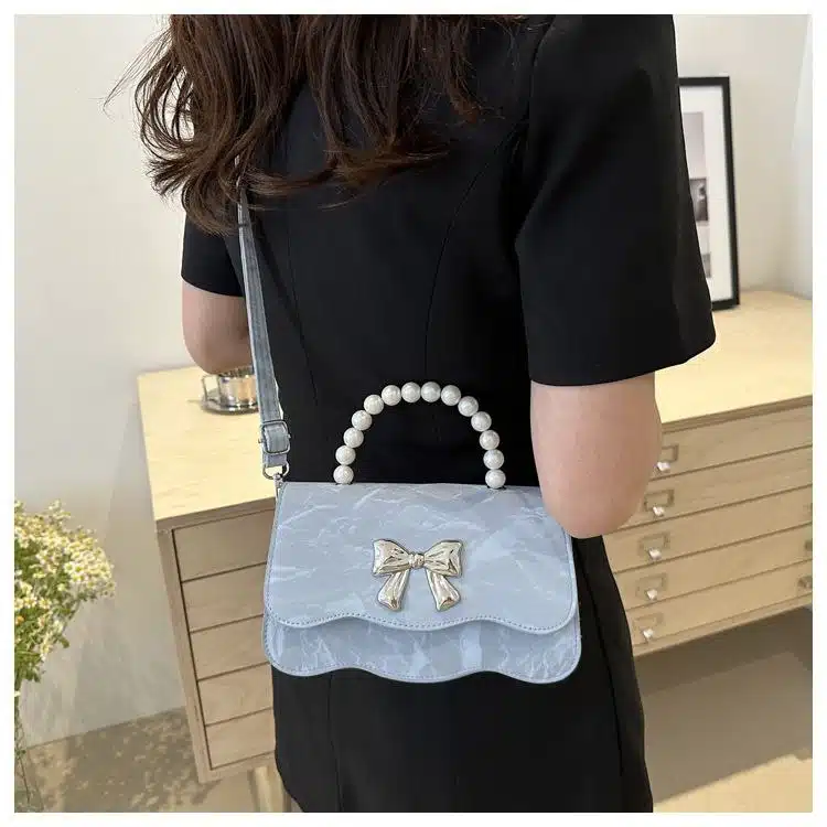 This elegant and dainty handbag features a unique marble-textured finish that adds a touch of artistic luxury to any outfit. It is beautifully accented with a metallic bow on the front flap and a sophisticated pearl bead top handle, making it a perfect choice for weddings, parties, or formal gatherings. The compact, structured silhouette ensures a refined look while providing enough space for your evening essentials.