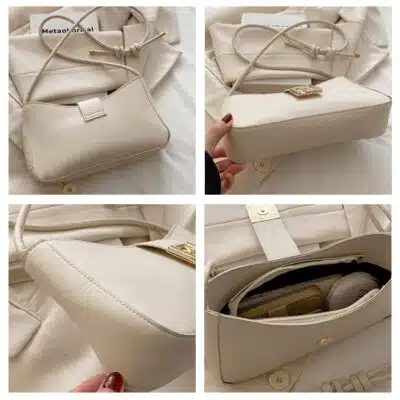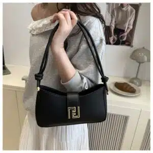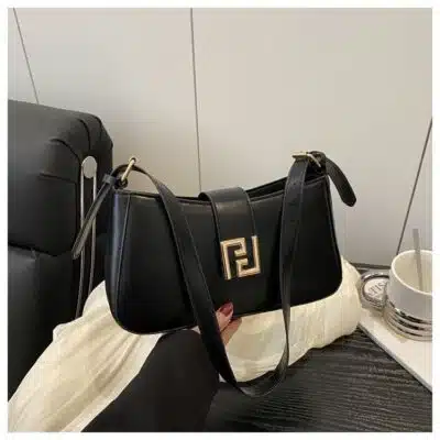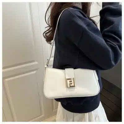 This chic baguette-style shoulder bag features a modern, clean-lined silhouette with a distinctive curved topline. Its minimalist aesthetic is centered around a bold, gold-tone square interlocking logo clasp on the front flap. The bag is accented with fashionable knotted strap details, making it a perfect blend of high-fashion style and everyday practicality. It is ideally sized to carry your daily essentials while maintaining a sleek, professional profile.
