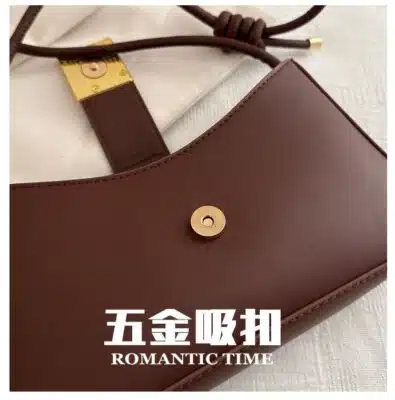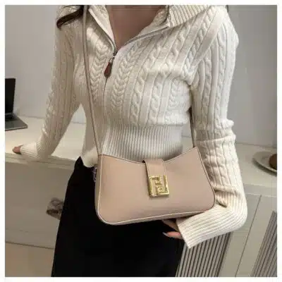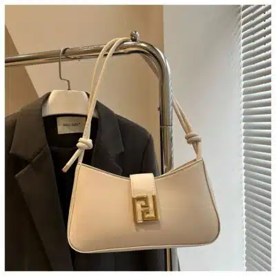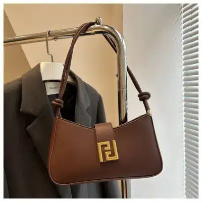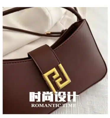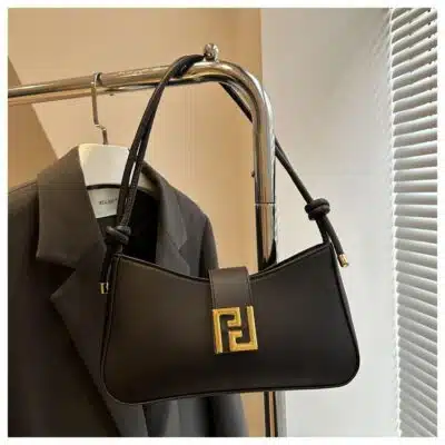 This is a chic and compact baguette-style shoulder bag featuring a clean, minimalist design highlighted by a polished gold-tone square buckle. Its sleek silhouette and versatile carrying options make it an ideal choice for both day and evening wear.