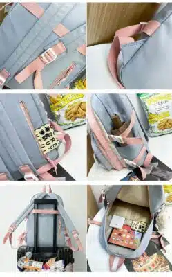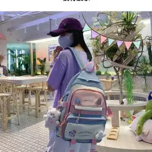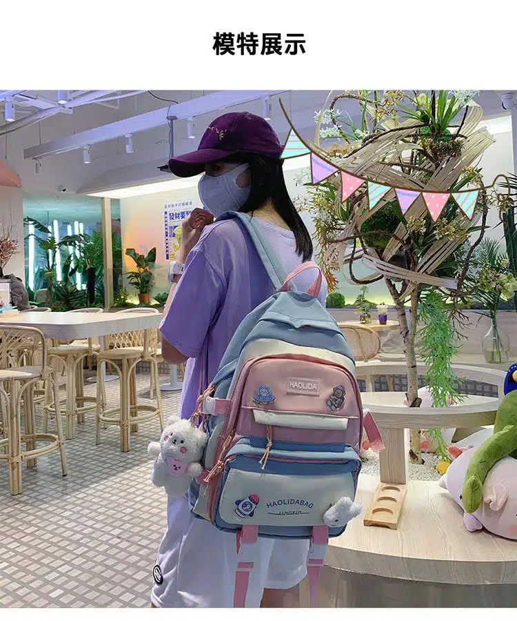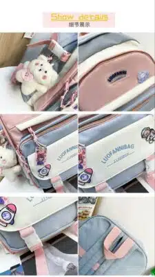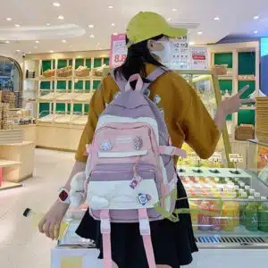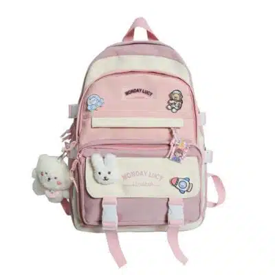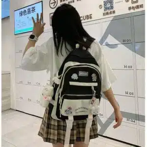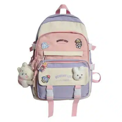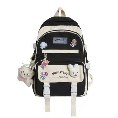 This is a functional and stylish multi-compartment backpack designed for students and daily commuters. Made from durable, water-repellent fabric, it features a playful aesthetic with multiple external pockets for organized storage and decorative accents.