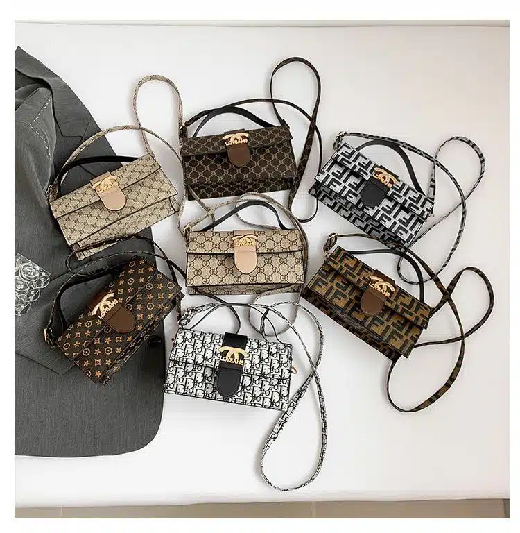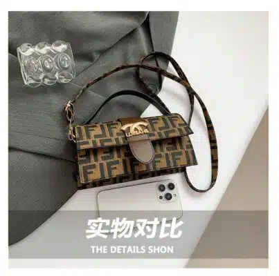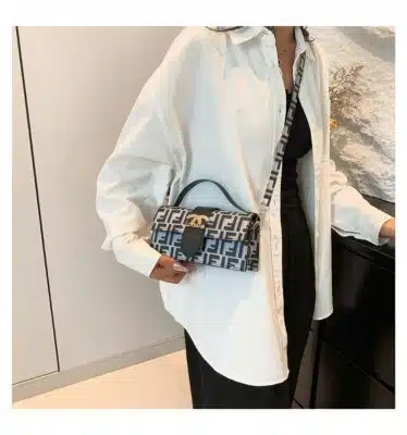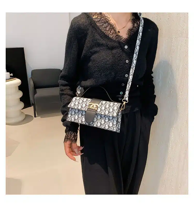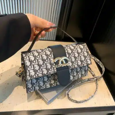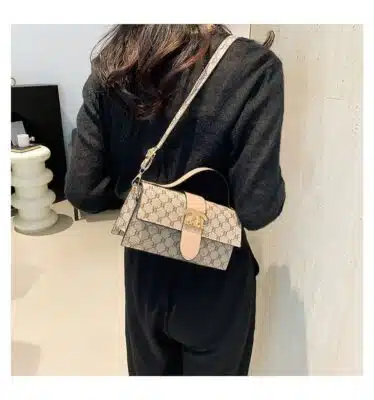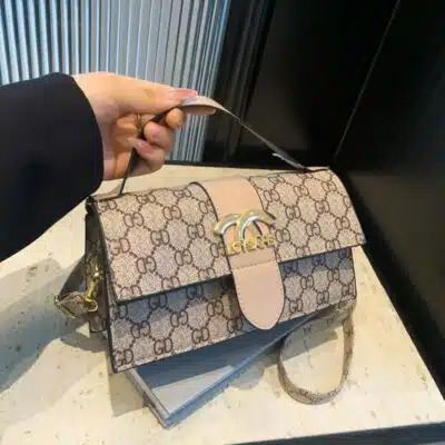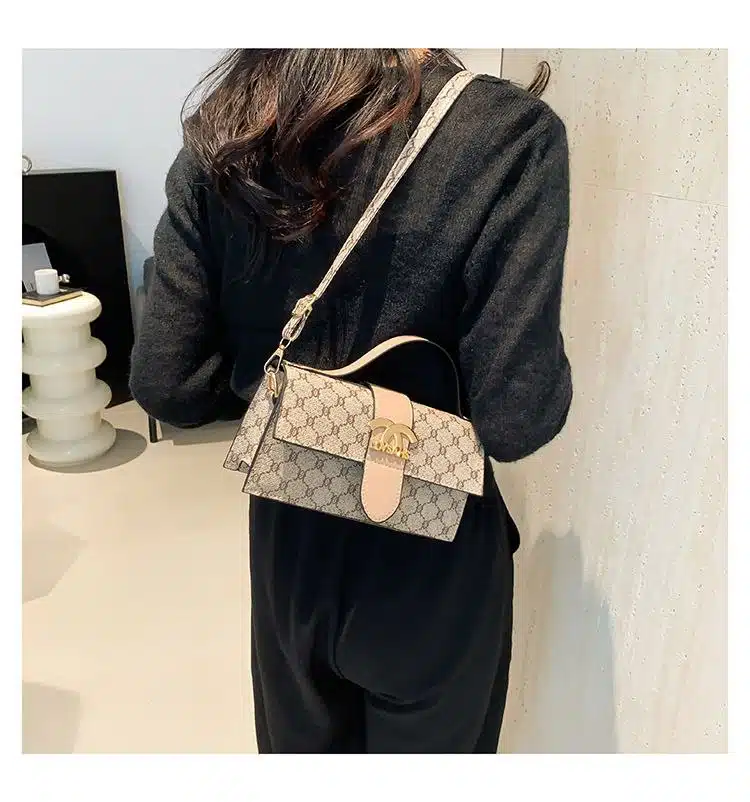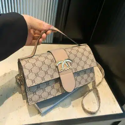 This chic top handle bag combines classic monogram-inspired patterns with a sleek, rectangular silhouette. Featuring a prominent gold-tone hardware logo on the front flap, this bag is designed for the modern trendsetter who values both style and convenience. Its structured design and adjustable strap make it a versatile accessory that transitions easily from a professional daytime look to a stylish evening ensemble.