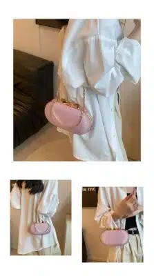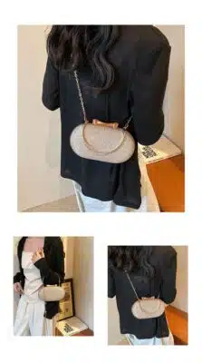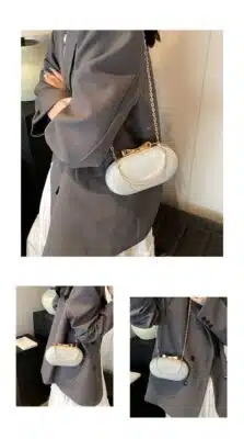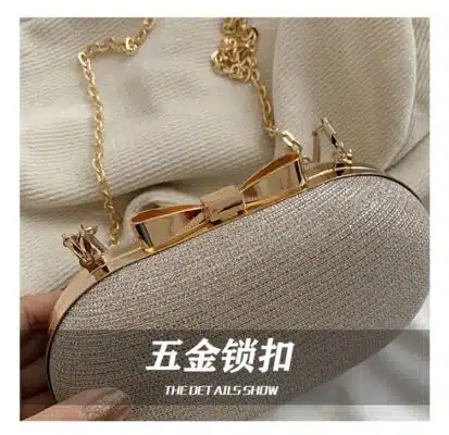 This elegant oval clutch is designed for formal occasions, featuring a luxurious shimmering exterior and a sophisticated metallic handle. The bag is accented with a delicate bow clasp at the top and comes with a detachable chain strap, allowing it to be worn as a shoulder bag or carried as a handheld clutch. Its compact and rounded silhouette makes it a perfect accessory for evening events, weddings, or parties.