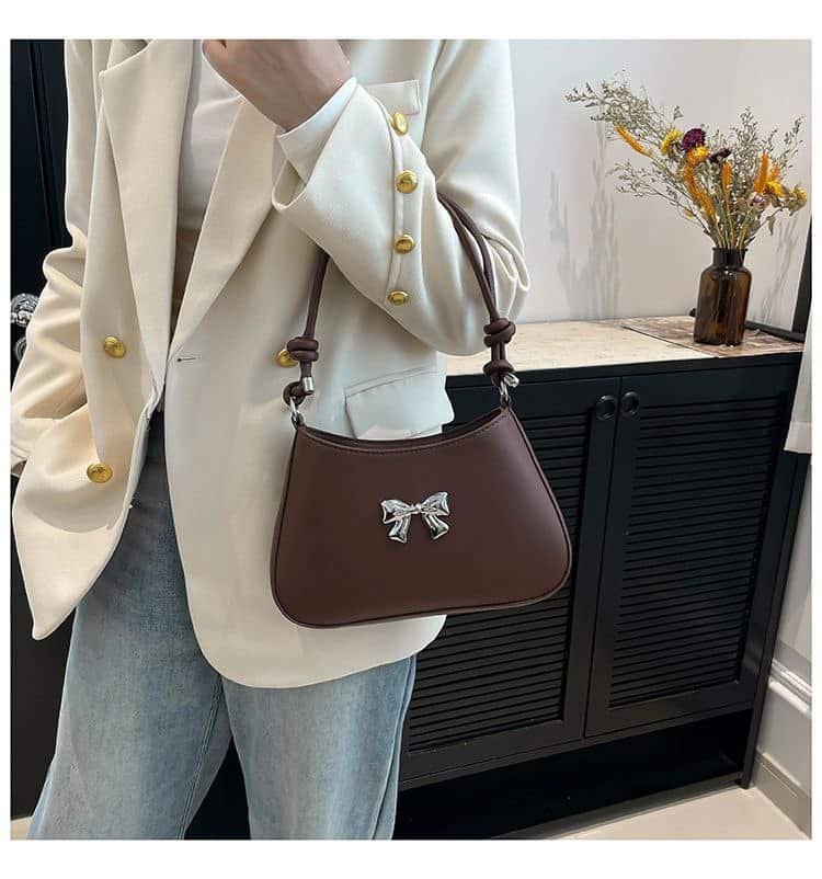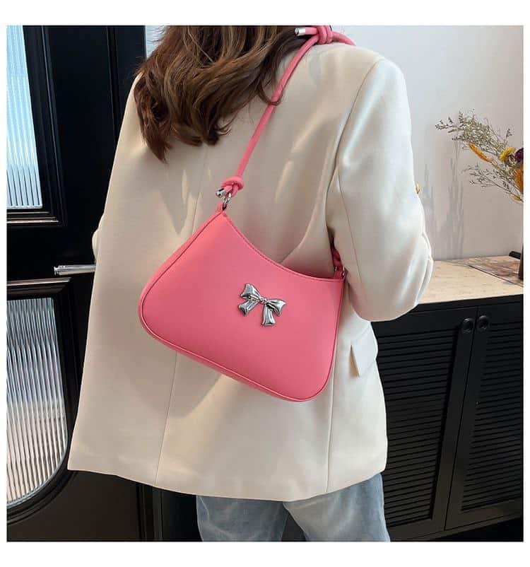 This bag is a prime example of minimalist design, featuring a small metallic ‘bow’ logo at the center. Its knotted handle design makes it even more fashionable. It is available in a variety of bright and classic colors to match any outfit.