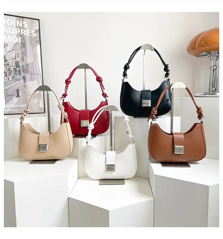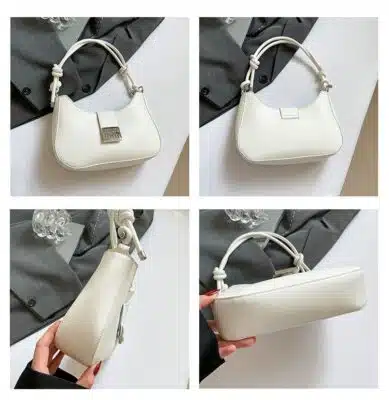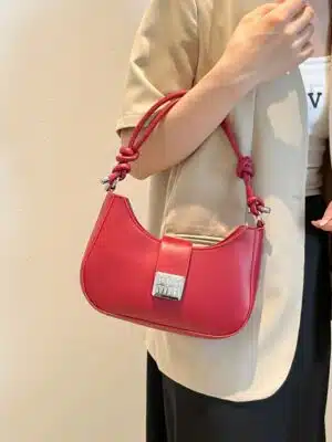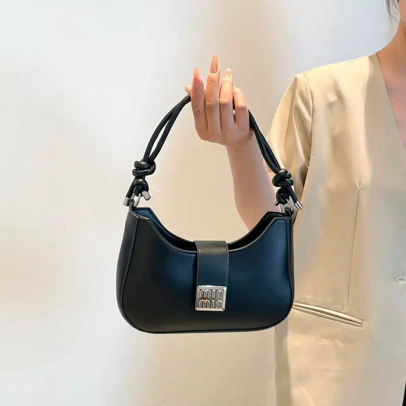 This elegant crescent-shaped shoulder bag is the perfect blend of modern curves and classic structure. Featuring a smooth, minimalist exterior and a bold, polished silver-tone buckle closure, it offers a high-end look that complements both professional and casual attire. The knotted handle details and clean silhouette make it a versatile must-have for any seasonal wardrobe.