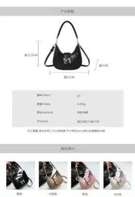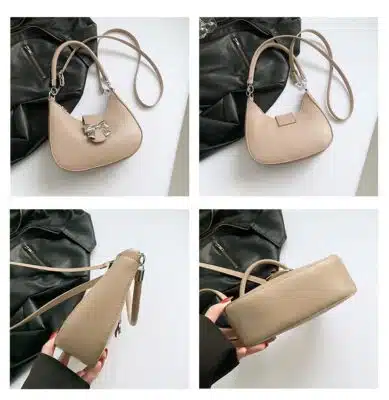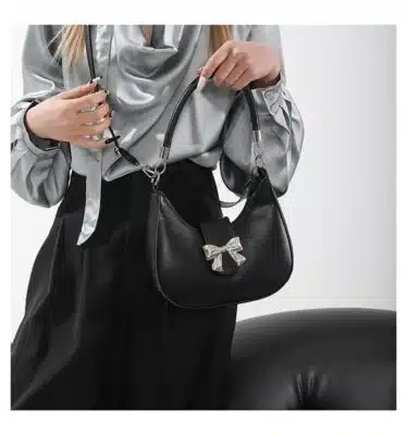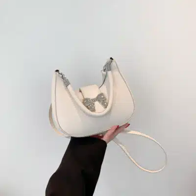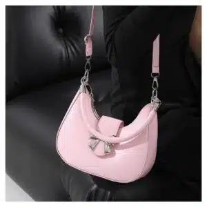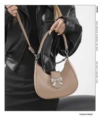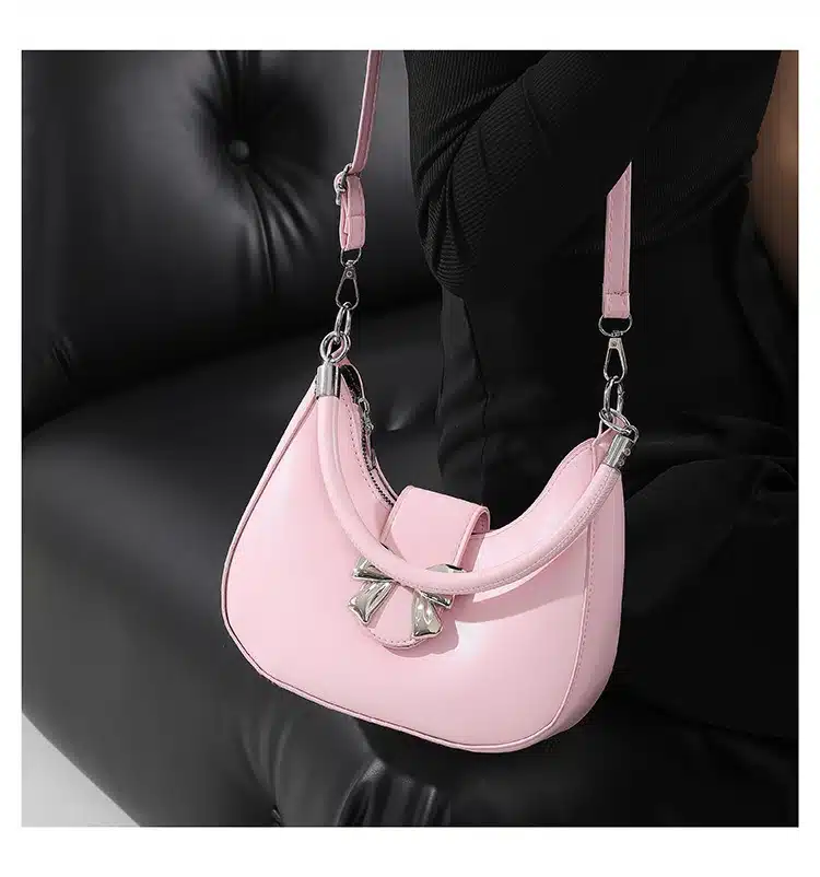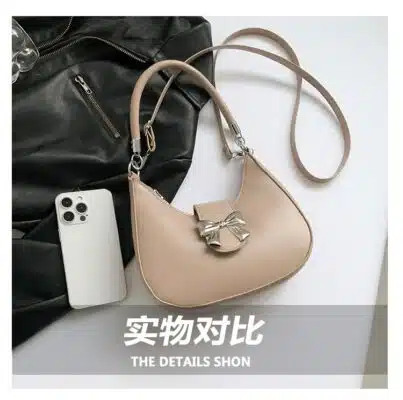 This is a trendy crescent-shaped shoulder bag that features a feminine metallic bow buckle on the front flap. Its curved silhouette and versatile carrying options make it an ideal choice for adding a touch of elegance to both casual and semi-formal outfits.