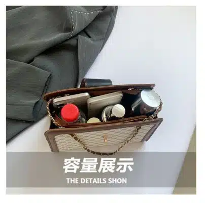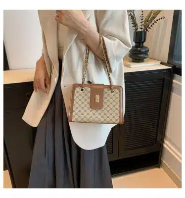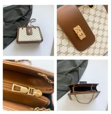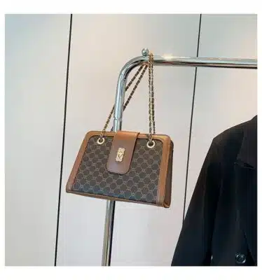 This is a sophisticated rectangular shoulder bag featuring a classic geometric pattern and structured design. Its combination of vintage aesthetics and modern hardware makes it an elegant choice for both professional environments and formal social events.